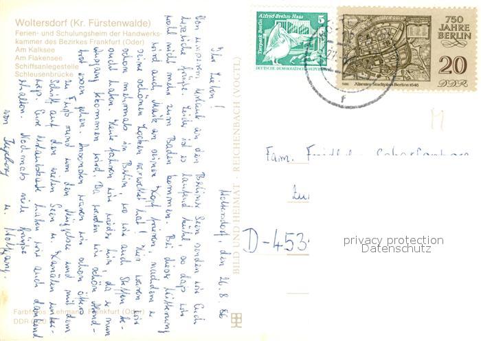 73061812 alte Postkarte Woltersdorf Erkner Ferien und Schulungsheim der Handwerkskammer Bezirk Frankfurt Oder See Anlegestelle Schleusenbruecke postalisch gelaufen Erhaltung siehe scans [FriedD77] KatCode: 11110012067544