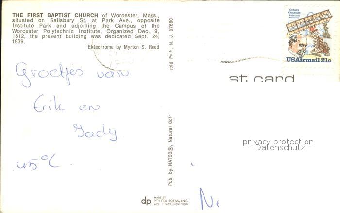 72497800 old postcard Worcester Massachusetts First Baptisst Church postalisch gelaufen Erhaltung siehe scans KatCode: 14140230000000