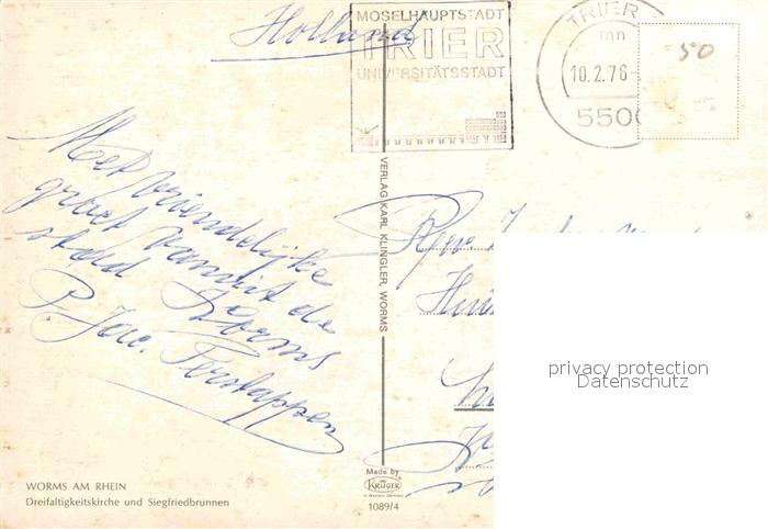 72914989 alte Postkarte Worms Rhein Dreifaltigkeitskirche Siegfriedbrunnen postalisch gelaufen Erhaltung siehe scans [FriedD77] KatCode: 11110007319000