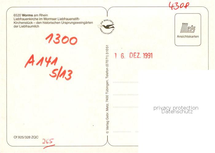 73834082 Worms Rhein Liebfrauenkirche im Wormser Liebfrauenstift Kirchenstueck Ursprungsweingaerten der Liebfraumilch postalisch nicht gelaufen Erhaltung siehe scans [WerneD78] KatCode: 11110007319000