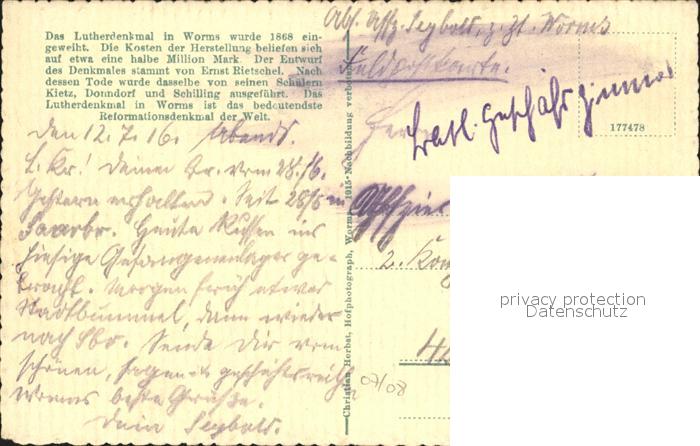 72118132 Worms Rhein Lutherdenkmal postalisch nicht gelaufen Feldpost Erhaltung siehe scans KatCode: 11110007319000