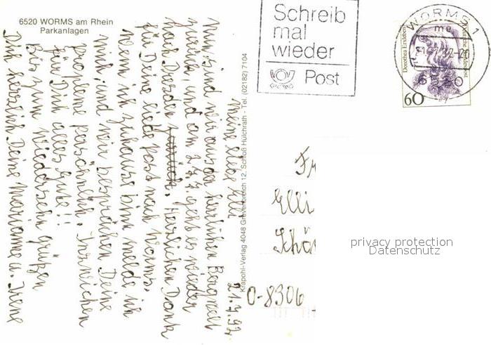 72769141 alte Postkarte Worms Rhein Parkanlagen Denkmal postalisch gelaufen Erhaltung siehe scans [FriedD77] KatCode: 11110007319000