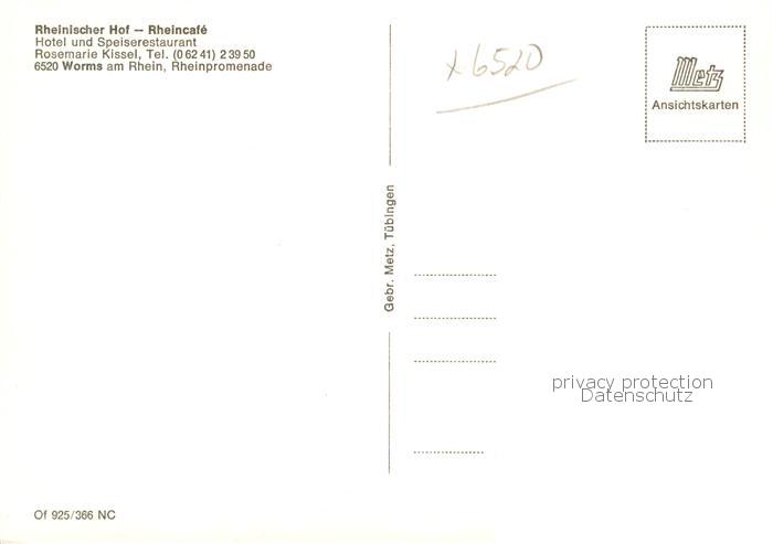 73844850 Worms Rhein Rheinischer Hof Rheincafe Hotel postalisch nicht gelaufen Erhaltung siehe scans [FriedD77] KatCode: 11110007319000