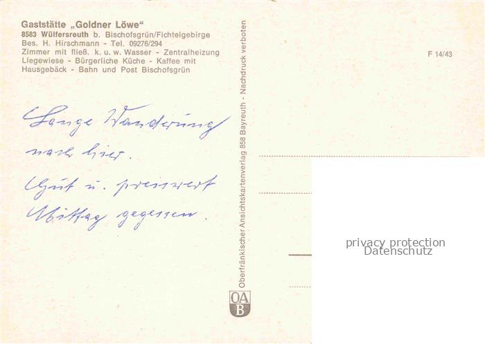 74036801 Wuelfersreuth Bischofsgruen Gaststaette Goldner Loewe Gastraum Terrasse Landschaftspanorama postalisch nicht gelaufen Erhaltung siehe scans [FriedD77] KatCode: 11110009472121