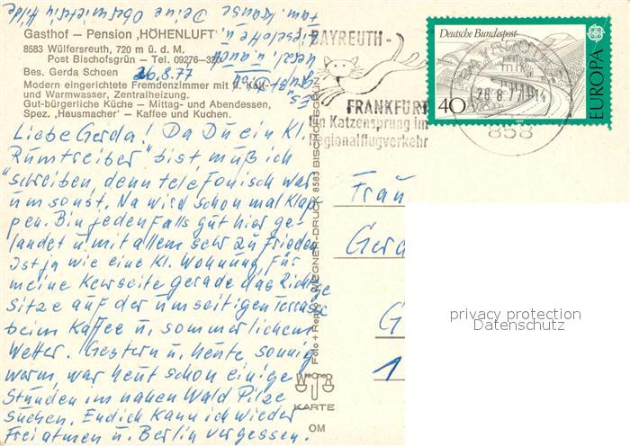 73654704 alte Postkarte Wuelfersreuth Gasthof Pension Hoehenluft Terrasse Kornfeld Landschaftspanorama postalisch gelaufen Erhaltung siehe scans [FriedD77] KatCode: 11110009472121