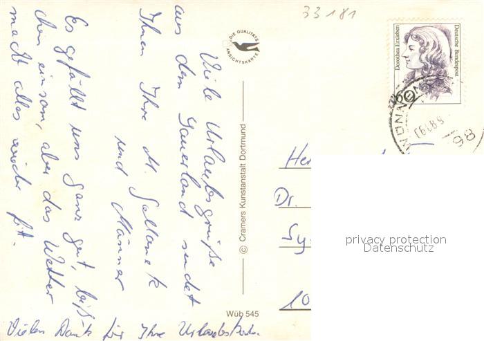 73672394 alte Postkarte Wuennenberg Panorama Luftkurort Blick zur Kirche Ortsmotiv mit Brunnen Partie am Teich postalisch gelaufen Erhaltung siehe scans [FriedD77] KatCode: 11110005774040
