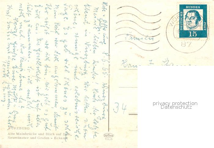 73061672 alte Postkarte Wuerzburg Alte Mainbruecke mit Domblick Neumuenster und Grafen Eckardt postalisch gelaufen Erhaltung siehe scans [WerneD78] KatCode: 11110009663000