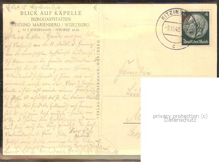 41478902 WueRZBURG Bayern Blick auf Kaepelle von der Festung Marienberg aus postalisch gelaufen Erhaltung siehe scans Alte Ansichtskarte Postkarte alte Postkarte Bert Katcode 11110009663000