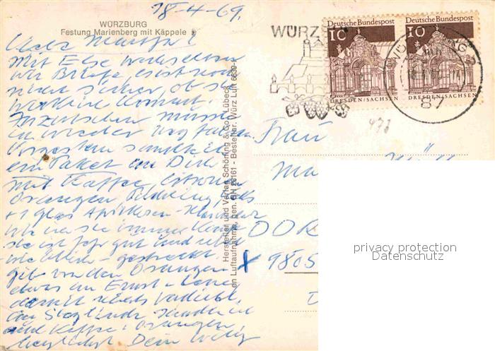 72904197 alte Postkarte WueRZBURG Bayern Fliegeraufnahme Festung Marienberg Kaeppele postalisch gelaufen Erhaltung siehe scans [NatalD47] KatCode: 11110009663000