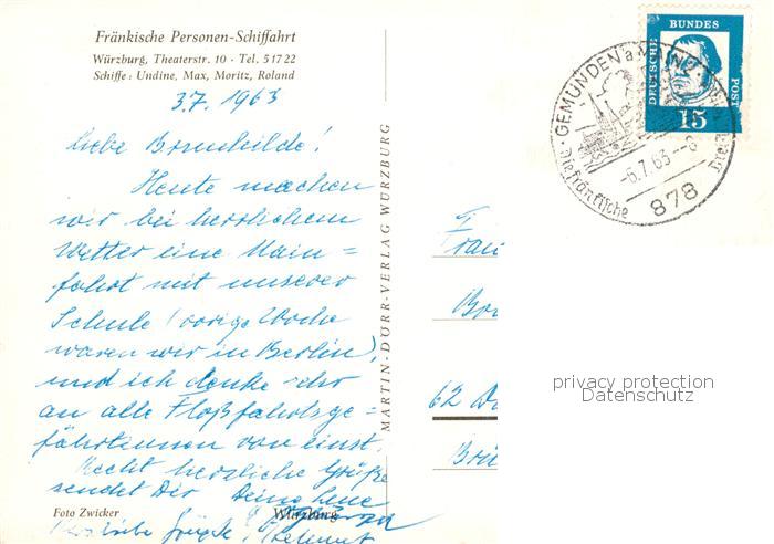73865111 alte Postkarte Wuerzburg Bayern Fraenkische Personen-Schiffahrt Dampfer Blick zum Schloss postalisch gelaufen Erhaltung siehe scans [FriedD77] KatCode: 11110009663000