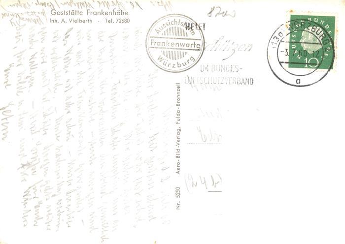73915045 alte Postkarte Wuerzburg Bayern Gaststaette Frankenhoehe Aussichtsturm Fliegeraufnahme postalisch gelaufen Erhaltung siehe scans [FriedD77] KatCode: 11110009663000