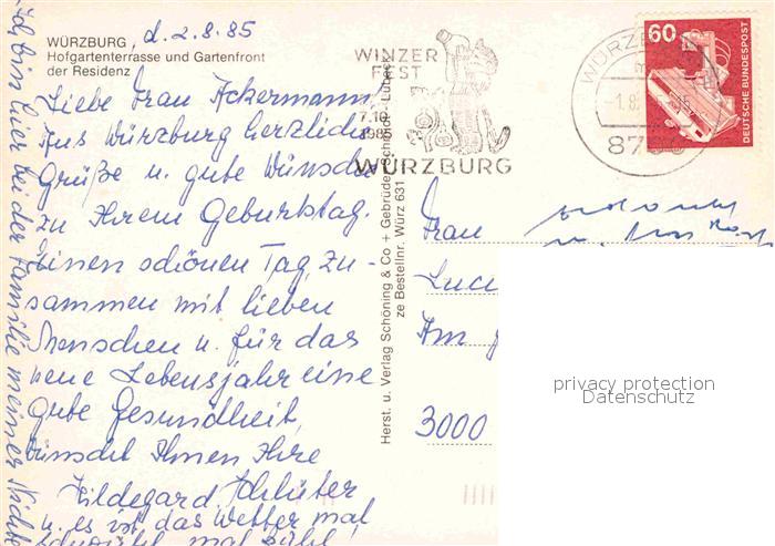 72757380 alte Postkarte WueRZBURG Bayern Hofgartenterrasse Gartenfront Residenz postalisch gelaufen Erhaltung siehe scans [KathaD81] KatCode: 11110009663000