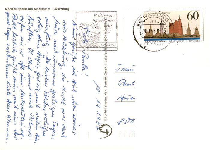 73879192 alte Postkarte Wuerzburg Bayern Marienkapelle am Marktplatz Fliegeraufnahme postalisch gelaufen Erhaltung siehe scans [WerneD78] KatCode: 11110009663000