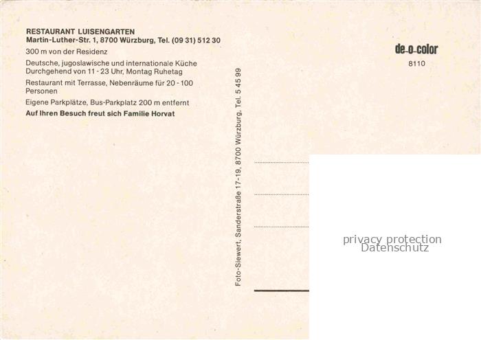 74054896 WueRZBURG Bayern Restaurant Luisengarten Gastraeume Terrasse postalisch nicht gelaufen Erhaltung siehe scans [WerneD78] KatCode: 11110009663000