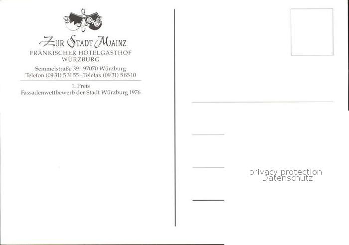 72148488 WueRZBURG Bayern Zur Stadt Mainz Hotelgasthof postalisch nicht gelaufen Erhaltung siehe scans KatCode: 11110009663000