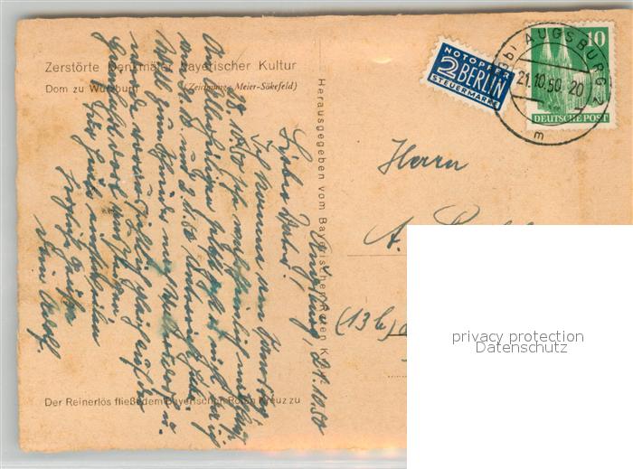 73162409 alte Postkarte Wuerzburg Dom Serie Zerstoerte Denkmaeler Bayerischer Kultur Kuenstlerkarte postalisch gelaufen Erhaltung siehe scans [FriedD77] KatCode: 11110009663000
