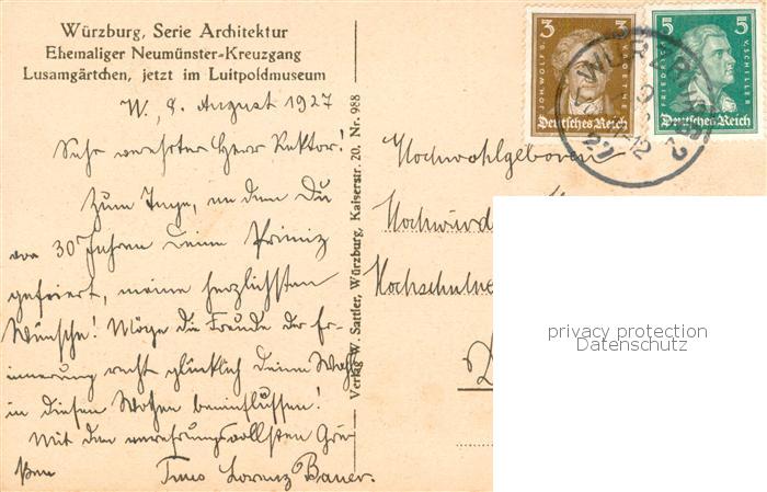 73776488 alte Postkarte Wuerzburg Serie Architektur Ehemaliger Neumuenster-Kreuzgang Lusamgaertchen jetzt im Luitpoldmuseum postalisch gelaufen Erhaltung siehe scans [FriedD77] KatCode: 11110009663000