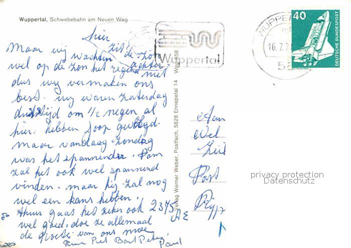 72679702 alte Postkarte WUPPERTAL NRW Schwebebahn am Neuen Weg postalisch gelaufen Erhaltung siehe scans [FriedD77] KatCode: 11110005124000