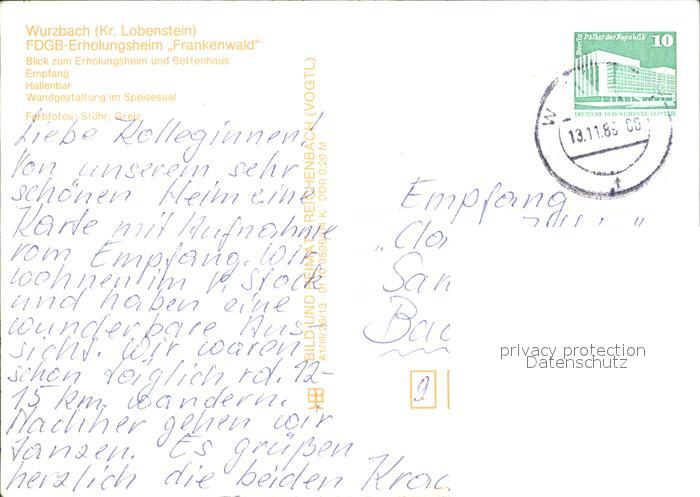72600470 alte Postkarte Wurzbach FDGB Erholungsheim Frankenwald Bettenhaus Empfang Hallenbar Speisesaal postalisch gelaufen Erhaltung siehe scans [FriedD77] KatCode: 11110008235055