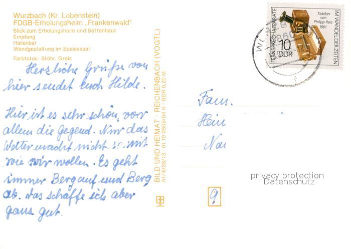 73209462 alte Postkarte Wurzbach FDGB Erholungsheim Frankenwald Empfang Hallenbar Speisesaal postalisch gelaufen Erhaltung siehe scans [FriedD77] KatCode: 11110008235055