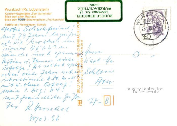 73181708 alte Postkarte Wurzbach Konsum Gaststaette Zum Sormitztal Altes Rathaus Erholungsheim Frankenwald postalisch gelaufen Erhaltung siehe scans [WerneD78] KatCode: 11110008235055
