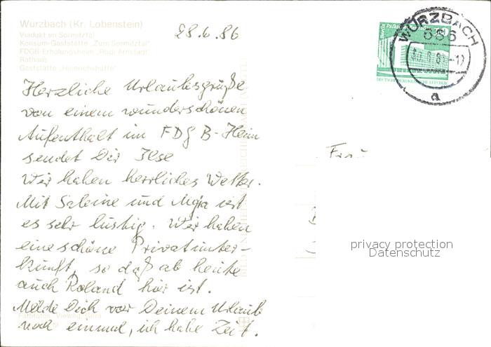 72114027 alte Postkarte Wurzbach Viadukt im Sormitztal Konsum Gaststaette Zum Sormitztal FDGB Heim Rudi Arnstadt Rathaus Gaststaette Heinrichshuette postalisch gelaufen Erhaltung siehe scans KatCode: 11110008235055