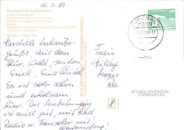 72576110 alte Postkarte Wurzbach Viadukt Sormitztal Konsum Gaststaette FDGB Erholungsheim Rathaus Technisches Denkmal postalisch gelaufen Erhaltung siehe scans [FriedD77] KatCode: 11110008235055
