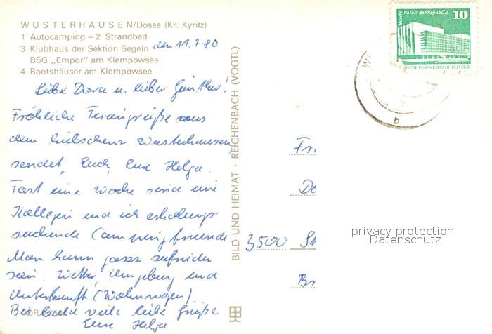 73046131 alte Postkarte Wusterhausen Dosse Autocamping Strandbad Klubhaus Sektion Segeln BSG Empor postalisch gelaufen Erhaltung siehe scans [KathaD81] KatCode: 11110012068477