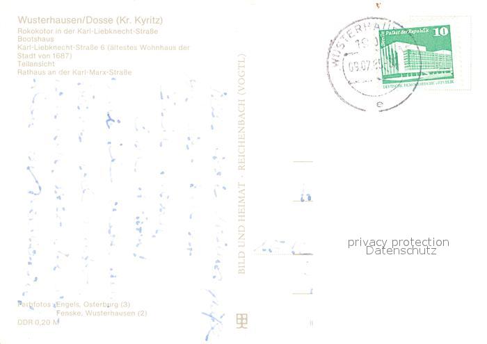 73103189 alte Postkarte Wusterhausen Dosse Rokokotor Karl Liebknecht Strasse Bootshaus Karl Liebknecht Strasse Teilansicht Rathaus postalisch gelaufen Erhaltung siehe scans [WerneD78] KatCode: 11110012068477