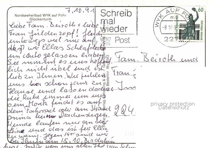 72783531 alte Postkarte Wyk Foehr Glockenturm postalisch gelaufen Erhaltung siehe scans [WerneD78] KatCode: 11110001054164