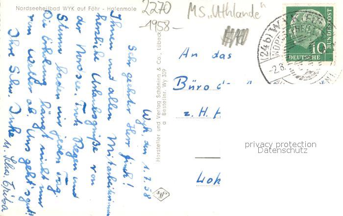 73690569 alte Postkarte Wyk Foehr Hafenmole postalisch gelaufen Erhaltung siehe scans [WerneD78] KatCode: 11110001054164