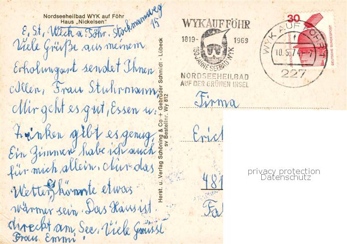 73833917 alte Postkarte Wyk Foehr Haus Nickelsen postalisch gelaufen Erhaltung siehe scans [FriedD77] KatCode: 11110001054164