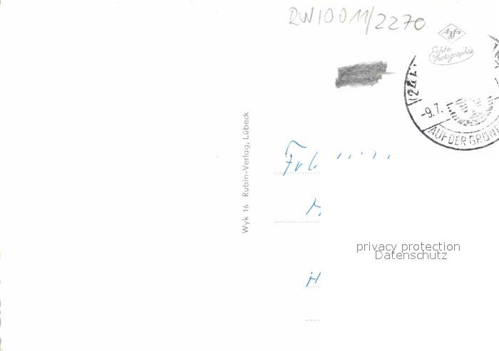 72694076 alte Postkarte Wyk Foehr Kleingolfplatz Sonnenuntergang Mittelbruecke Leuchtturm Kurhaus Lesehalle Windmuehle postalisch gelaufen Erhaltung siehe scans [FriedD77] KatCode: 11110001054164