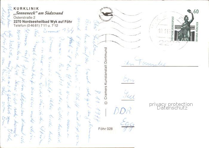 72577760 alte Postkarte Wyk Foehr Kurklinik Sonneneck am Suedstrand Nordseeheilbad postalisch gelaufen Erhaltung siehe scans [FriedD77] KatCode: 11110001054164