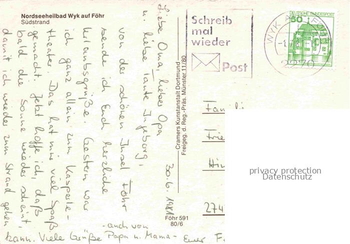 74086373 alte Postkarte WYK FoeHR Nordfriesland Suedstrand Fliegeraufnahme postalisch gelaufen Erhaltung siehe scans [WerneD78] KatCode: 11110001054164
