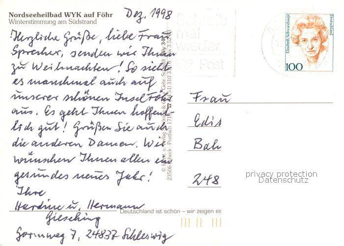 73237608 alte Postkarte Wyk Foehr Winterstimmung am Suedstrand postalisch gelaufen Erhaltung siehe scans [LiesaD40] KatCode: 11110001054164