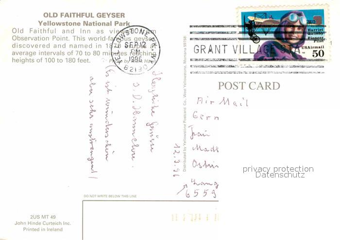 72898139 old postcard Yellowstone National Park Old Faithful Geyser postalisch gelaufen Erhaltung siehe scans [KathaD81] KatCode: 14140530000000