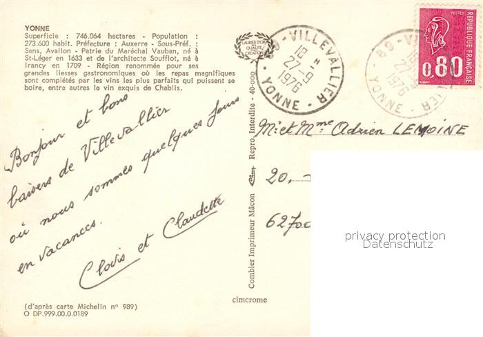 13326327 carte postale Yonne Region Vezelay Auxerre Tonnerre Avallon St Fargeau St Julien du Sault Villeneuve St Florentin Joigny Migennes postalisch gelaufen Erhaltung siehe scans [WerneD78] KatCode: 11170089189024