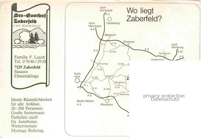 74053025 Zaberfeld Heilbronn BW See Gasthof Gastraeume Stausee Ehmetsklinge postalisch nicht gelaufen Werbekarte (keine Postkarte) Erhaltung siehe scans [WerneD78] KatCode: 11110008125108