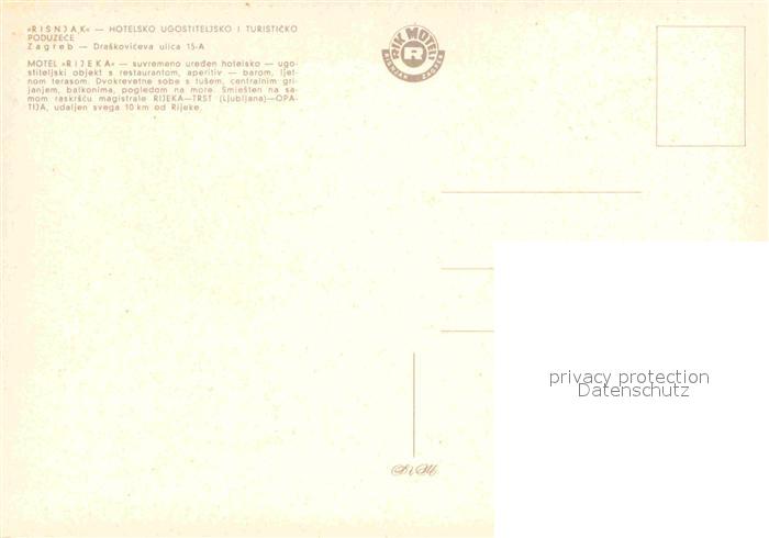 Zagreb Risnjak Hotelsko Ugostiteljsko i Turisticko Poduzece Motel Rijeka Meerblick Berge postalisch nicht gelaufen Erhaltung siehe scans [FriedD77]