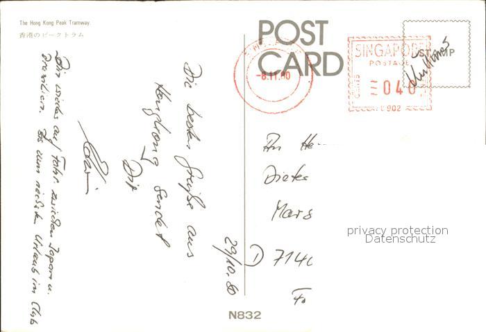 alte Postkarte Zahnradbahn Hong Kong Peak Tramway postalisch gelaufen Erhaltung siehe scans