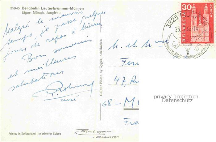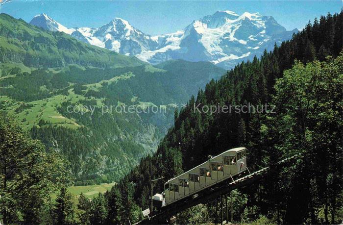 74105678 alte Postkarte Zahnradbahn Standseilbahn Furniculaire Rack Railway– Lauterbrunnen Muerren Eiger Moench Jungfrau postalisch gelaufen Erhaltung siehe scans [IrynaD87] KatCode: 22040000000100