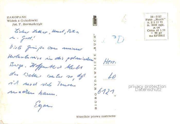 12756737 old postcard Zakopane Panorama postalisch gelaufen Erhaltung siehe scans [AndreD76] KatCode: 11410