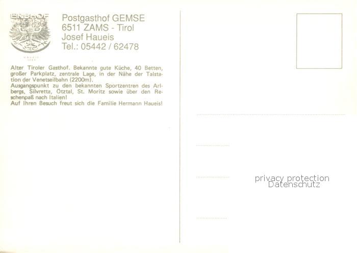 73629005 Zams Post Gasthof Gemse postalisch nicht gelaufen Erhaltung siehe scans [WerneD78] KatCode: 11390334070630