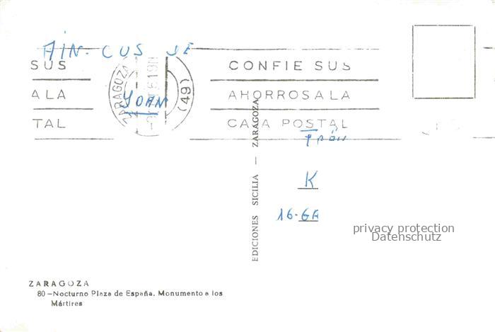 74095364 ZARAGOZA Saragossa ES Nocturna Plaza de Espana Monumento a los Martires postalisch nicht gelaufen Erhaltung siehe scans [WerneD78] KatCode: 11510