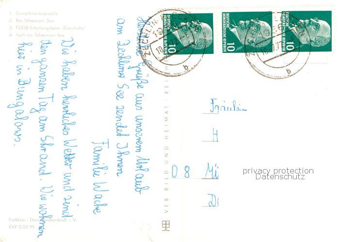 73810431 alte Postkarte Zechlin Rheinsberg Ostprignitz-Ruppin Brandenburg Dampferanlegestelle Am Schwarzen See FDGB Erholungsheim Elsenhoehe Seepartie postalisch gelaufen Erhaltung siehe scans [FriedD77] KatCode: 11110012068353