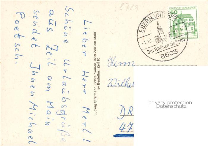 73865879 alte Postkarte Zeil Main Ortsansicht mit Kirche Marktplatz Partie am Stadtsee Altachbruecke postalisch gelaufen Erhaltung siehe scans [FriedD77] KatCode: 11110009674221