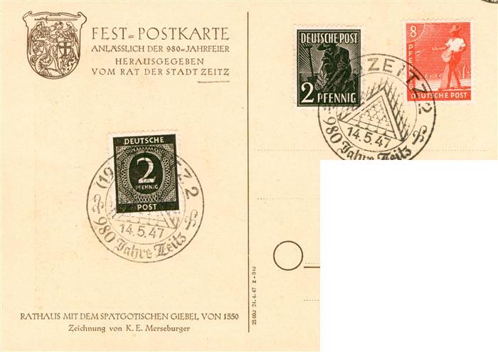 73872500 ZEITZ Sachsen-Anhalt Festpostkarte anlaesslich der 980-Jahrfeier Rathaus spaetgotischer Giebel 16. Jhdt. Kuenstlerkarte postalisch gelaufen Erhaltung siehe scans [FriedD77] alte Postkarte Frie Katcode 11110015084590