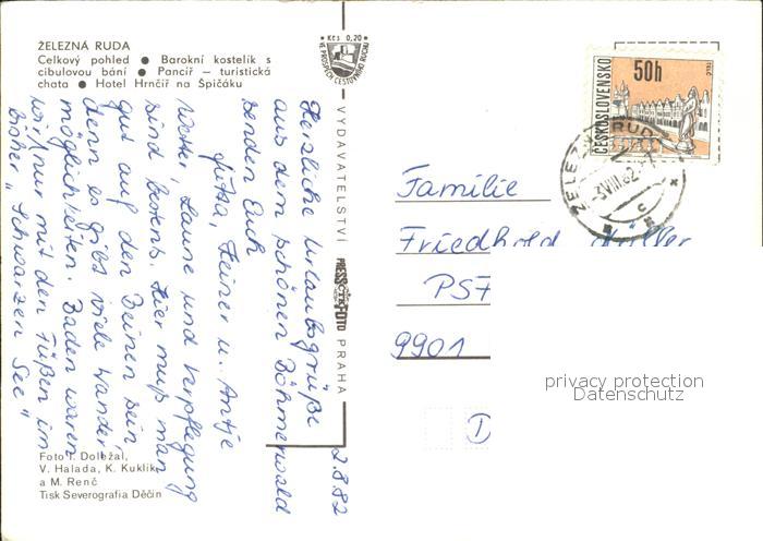 old postcard Zelezna Ruda Markt Eisenstein Celkovy pohled Barockni kostelik s cibulovou bani Pancir turisticka chata Hotel Hrncir na Spicaku postalisch gelaufen Erhaltung siehe scans