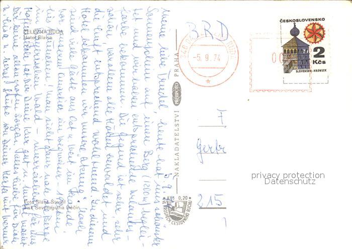 old postcard Zelezna Ruda Markt Eisenstein Hotel Slavie postalisch gelaufen Erhaltung siehe scans